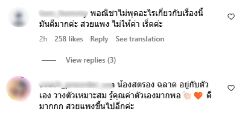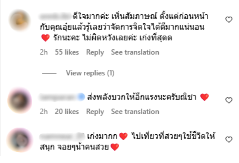 หลังจากโพสต์ไปไม่นานก็มีแฟนคลับเข้ามาคอมเมนต์ให้กำลังใจเป็นจำนวนมาก รวมถึง “แม่ยุ้ย” ก็รีบแปะหัวใจสีแดงในคอมเมนต์ลูกสาวตัวเองทันที