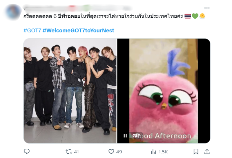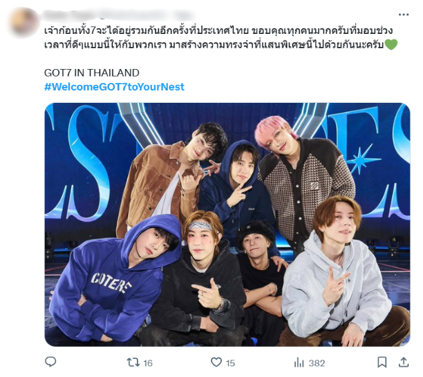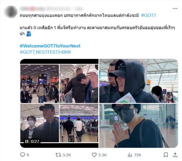 และวันที่รอคอยก็ขยับเข้าใกล้มาถึงแล้ว ล่าสุดเมมเบอร์ GOT7 เริ่มเดินทางมาถึงประเทศไทยเมื่อช่วงเช้าที่ผ่านมา ซึ่งอากาเซ่ก็ให้การต้อนรับแบบอบอุ่น เรียกได้ว่าดีใจจนน้ำตาคลอกันเลยทีเดียวที่ได้เห็น GOT7 รวมตัวกันอีกครั้ง จนทำให้ #WelcomeGOT7toYourNest ติดเทรนด์อันดับ 1 ของประเทศไทย