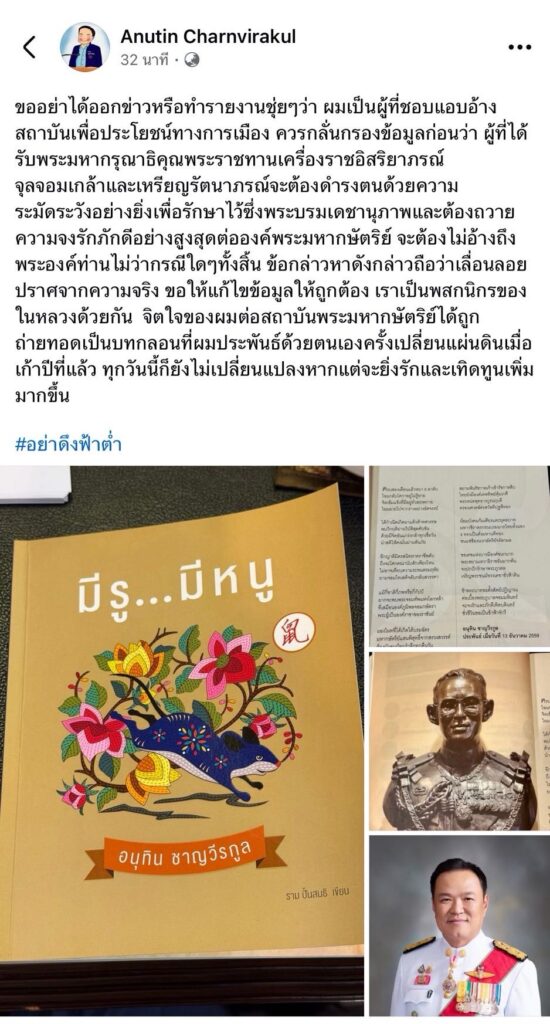 นายอนุทิน ชาญวีรกูล รองนายกฯรัฐมนตรีและรัฐมนตรีว่าการกระทรวงมหาดไทย โพสต์ Facebook ส่วนตัวระบุ “ขออย่าได้ออกข่าวหรือทำรายงานชุ่ยๆว่า ผมเป็นผู้ที่ชอบแอบอ้างสถาบันเพื่อประโยชน์ทางการเมือง ควรกลั่นกรองข้อมูลก่อนว่า ผู้ที่ได้รับพระมหากรุณาธิคุณพระราชทานเครื่องราชอิสริยาภรณ์จุลจอมเกล้าและเหรียญรัตนาภรณ์จะต้องดำรงตนด้วยความระมัดระวังอย่างยิ่งเพื่อรักษาไว้ซึ่งพระบรมเดชานุภาพและต้องถวายความจงรักภักดีอย่างสูงสุดต่อองค์พระมหากษัตริย์ จะต้องไม่อ้างถึงพระองค์ท่านไม่ว่ากรณีใดๆทั้งสิ้น ข้อกล่าวหาดังกล่าวถือว่าเลื่อนลอย ปราศจากความจริง ขอให้แก้ไขข้อมูลให้ถูกต้อง เราเป็นพสกนิกรของในหลวงด้วยกัน จิตใจของผมต่อสถาบันพระมหากษัตริย์ได้ถูกถ่ายทอดเป็นบทกลอนที่ผมประพันธ์ด้วยตนเอง