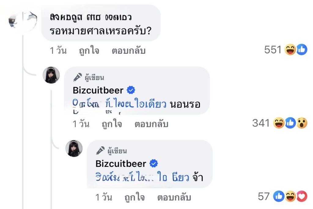 และยังมีอีกคอมเมนต์จากชาวเน็ตว่า “ รอหมายศาลหรอครับ? ซึ่งสาว“เบียร์” ก็ตอบกลับทันที่ว่า “นอนรอจ้า“