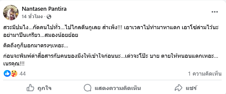 “สวะมีปมไง…กัดคนไปทั่ว…ไปไกลตีนกูเลย สำเพ็ง!!! เอาเวลาไปทำมาหาแดก เอาโซ่ล่ามไว้นะ อย่ามาปีนเกรียว…สมองน้อยย้อย คิดถึงกูก็บอกมาตรงๆเหอะ… ก่อนจะพิมพ์ด่าสื่อสารกับคนของมึงให้เข้าใจก่อนนะ…เด่วจะโป๊ะ บาย ตายให้หนอนแดกเหอะ…เนรคุณ!!!”