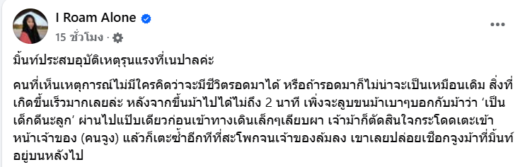 เกือบไม่รอด! “มิ้นท์ I Roam Alone” ตกม้าที่เนปาล หวิดลงเหว ล่าสุดปลอดภัยแล้ว ฟกช้ำเล็กน้อย แฟนคลับส่งกำลังใจ