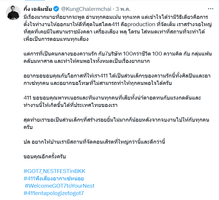 แต่ก็ยังไม่วายมีดราม่าเรื่องผู้จัดคอนเสิร์ตโดย “กึ้ง เฉลิมชัย” ซึ่งมีปัญหาเกิดขึ้นตั้งแต่วันกดบัตรจนถึงวันงาน ทั้งนี้หลังจบคอนเสิร์ตเจ้าตัวก็ได้ออกมาโพสต์ขอโทษร่ายยาว แต่สิ่งที่อากาเซ่โฟกัสคือประโยคที่ว่า “วิธีเดียวคือการตั้งใจทำงานให้ออกมาให้ดีที่สุดในสไตล411 คือproduction ที่จัดเต็ม เราสร้างจอใหญ่ที่สุดที่เคยมีในสนามราชมังคลา เครื่องเสียง พลุ โดรน ใส่หมดเท่าที่สถานที่จะทำได้ เพื่อเป็นการตอบแทนทุกเสียง” ซึ่งทำให้หลายคนไม่พอใจเป็นอย่างมาก
