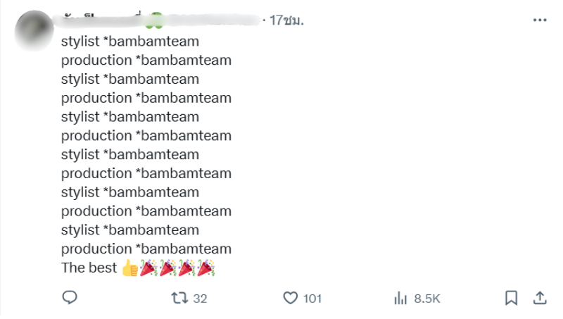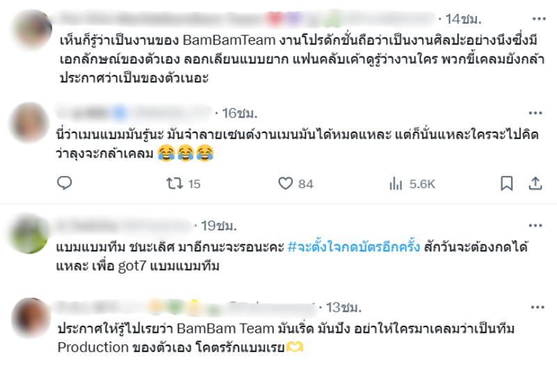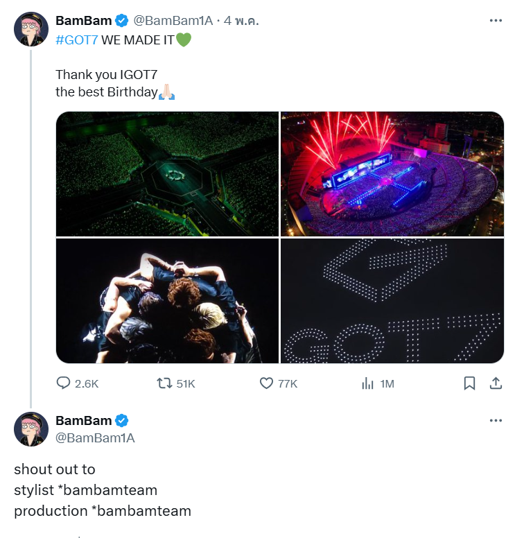 ล่าสุด “แบมแบม” สมาชิกคนไทยของวง GOT7 ก็ได้ทวิตข้อความแบบลอย ๆ ว่า ” shout out to stylist *bambamteam production *bambamteam” เป็นการประกาศไปเลยว่าคอนเสิร์ตที่สำเร็จลุล่วงไปได้ดีนั้นเป็นเพราะ “bambamteam” เรียกได้ว่าสิ่งนี้ถูกใจอากาเซ่เป็นที่สุด