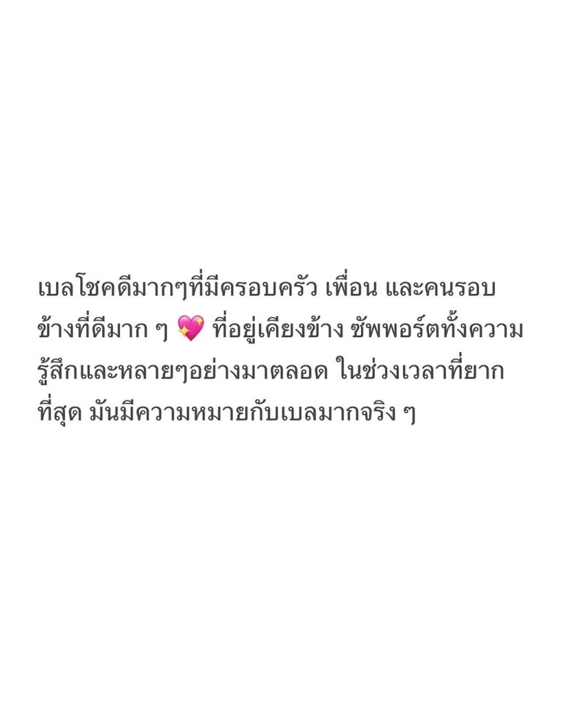 เบลโชคดีมากๆที่มีครอบครัว เพื่อน และคนรอบข้างที่ดีมาก ๆ ที่อยู่เคียงข้าง ซัพพอร์ตทั้งความรู้สึกและหลายๆอย่างมาตลอด ในช่วงเวลาที่ยากที่สุด มันมีความหมายกับเบลมากจริง ๆ”