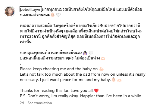 และได้ระบุแคปชั่นว่า “ฝากทุกคนช่วยเป็นกำลังใจให้คุณแม่มือใหม่ และเบบี๋ตัวน้อยของเบลด้วยนะคะ👶🏻🤍 เบลขอความร่วมมือ ไม่พูดหรืออธิบายอะไรเกี่ยวกับฝ่ายชายไปมากกว่านี้ หากไม่มีความจำเป็นจริงๆ เบลเลือกที่จะเดินหน้าต่อโดยไม่กล่าวโทษใคร เพราะเวลานี้ ลูกคือสิ่งสำคัญที่สุด ตอนนี้เบลต้องการโฟกัสตัวเองและลูกเท่านั้น ขอบคุณทุกคนที่อ่านจบถึงตรงนี้นะคะ🙇🏻♀️🤍 ปล:ตอนนี้เบลมีความสุขมากๆค่ะ ไม่ต้องเป็นห่วง🫶🏻: Please keep cheering me and the baby on.💪🏻 Let’s not talk too much about the dad from now on unless it’s really necessary. I just want peace for me and my baby.👶🏻🫶🏻 Thanks for reading this far. Love you all.❤️ P.S. Don’t worry, I’m really okay. Happier than I’ve been in a while.”