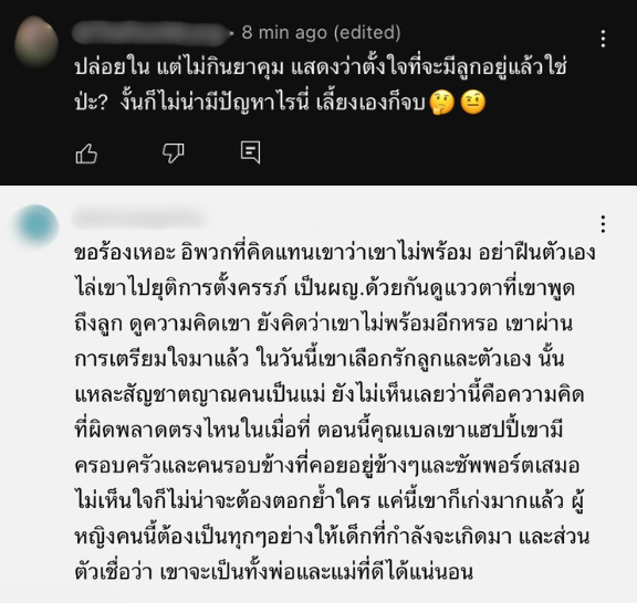 สุดท้าย เบลได้เรียนรู้ว่า ไม่ใช่ทุกคนจะคู่ควรกับความรักและความไว้ใจที่เรามอบให้ การเดินออกมาวันนี้ คือการเลือกตัวเอง และเลือกสิ่งที่มีค่าที่สุดในชีวิต คือ ‘ลูก’ เบลอยากมีความสุขและสร้างสภาพแวดล้อมที่ดีที่สุดให้กับลูก เพราะเบลเชื่อว่าทุกอย่างส่งผลถึงเด็กโดยตรง จนถึงวันนี้ ทางฝ่ายชายและครอบครัวยังไม่ได้แสดงเจตนารับผิดชอบใด ๆ อย่างชัดเจน ทั้งที่มีการพูดคุยและนัดเจอกันหลายครั้งแล้ว ซึ่งที่ผ่านมา เบลและครอบครัวก็พยายามเต็มที่มาตลอดพยายามใจเย็น เปิดโอกาสให้พูดคุยอย่างตรงไปตรงมา แต่ก็ยังไม่ได้รับความชัดเจน เบลจึงขอเลือกที่จะปล่อยวาง