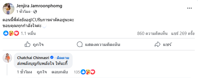 ทางด้านภรรยา “กี้ เจนจิรา” ก็ได้ออกมาโพสต์อัปเดตความเคลื่อนไหวอยู่เรื่อย ๆ ซึ่งหลายโพสต์ทำเอาแฟนคลับรู้สึกบีบหัวใจอยู่ไม่น้อย