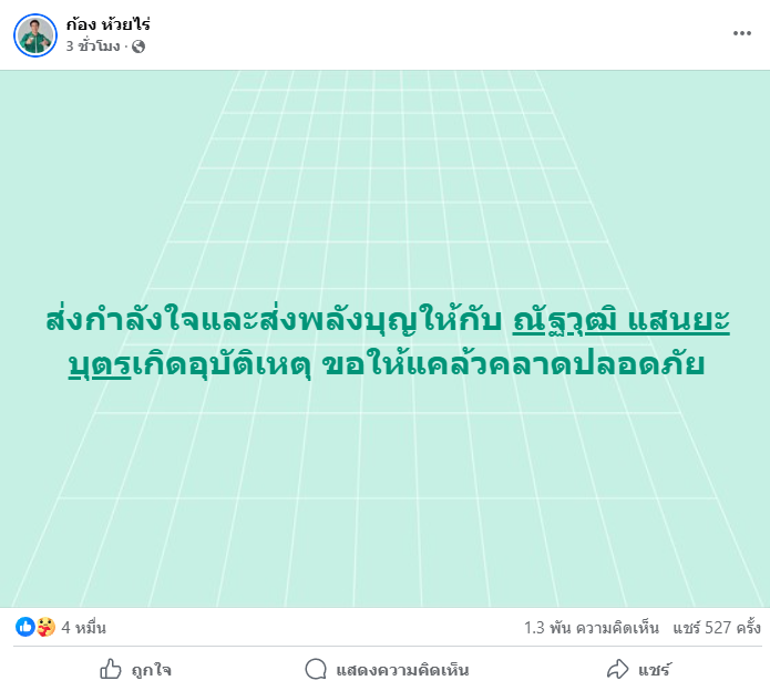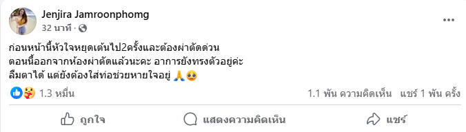 โดยอัปเดตล่าสุด “กี้” ได้โพสต์ข้อความว่า “ก่อนหน้านี้หัวใจหยุดเต้นไป2ครั้งและต้องผ่าตัดด่วนตอนนี้ออกจากห้องผ่าตัดแล้วนะคะ อาการยังทรงตัวอยู่ค่ะ ลืมตาได้ แต่ยังต้องใส่ท่อช่วยหายใจอยู่ ”