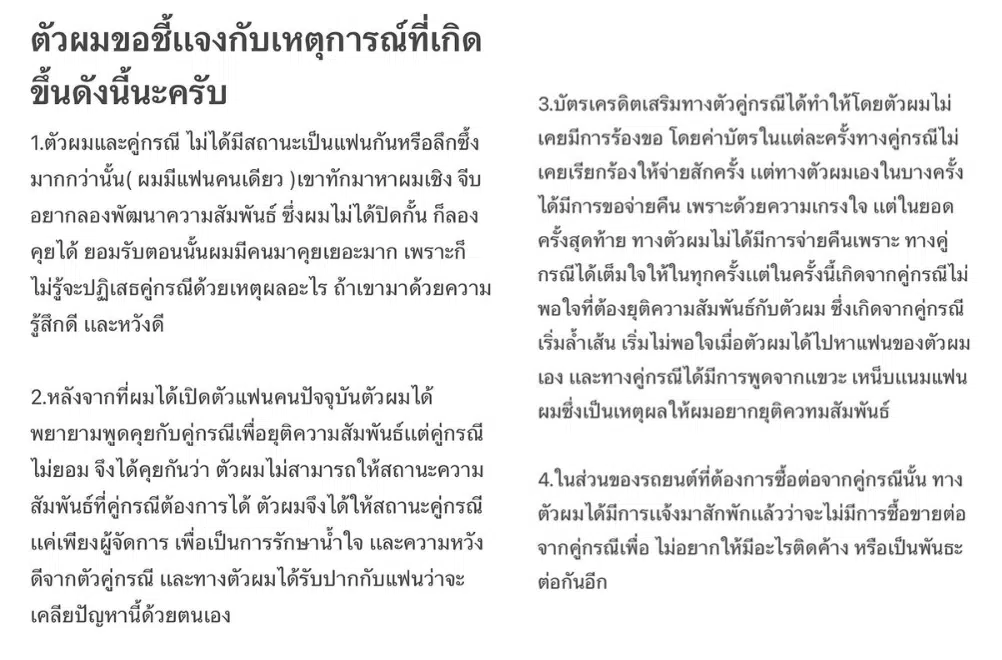 และ “ฉลามจัส” ก็ได้ออกมาชี้แจงเช่นกัน เจ้าตัวยืนยันว่ามีแฟนเพียงคนเดียว คือ “มิกซ์” แต่ยอมรับว่าคู่กรณีเคยทักมาพูดคุยเชิงชู้สาว ซึ่งฝ่ายชายก็ได้ให้คำตอบที่ชัดเจนว่าไม่สามารถพัฒนาสถานะไปมากกว่าพี่น้องได้ พร้อมยืนยันความสัมพันธ์คู่กรณี ตนมองเพียงผู้ใหญ่ที่เข้ามาคอยซัพพอร์ตเท่านั้น ตลอดระยะเวลาคู่กรณีก็มีแฟนอยู่แล้ว ไม่เข้าใจต้องการสิ่งใดจากตน