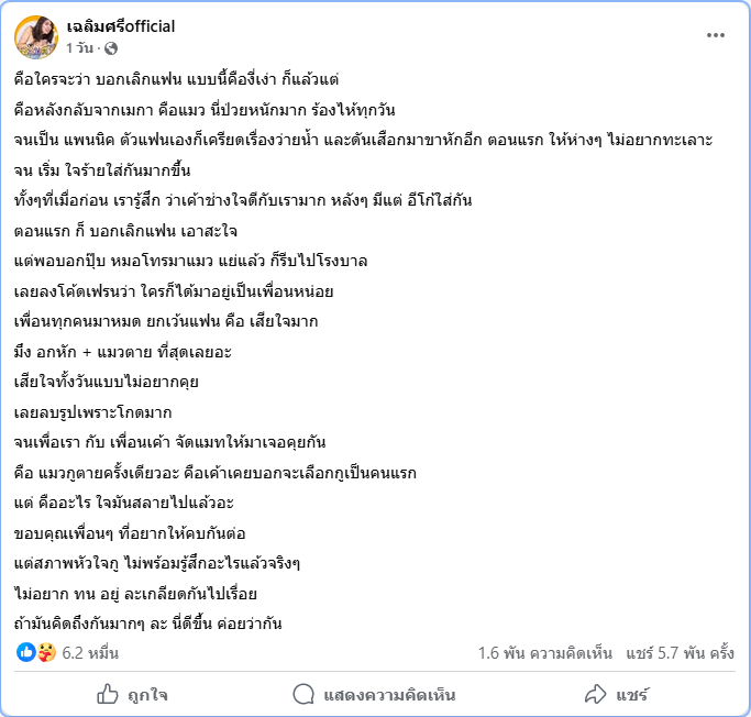 ซึ่งเรื่องนี้ “มิกซ์” ก็ได้ท้าวความเรื่องราวและบอกเหตุผลทั้งหมดที่ทำให้เลิกกัน ไม่ใช่แค่เพราะไม่ไปหาตอนแมวตายทำให้ชาวเน็ตหลายคนเข้าใจเธอมากขึ้นทันที
