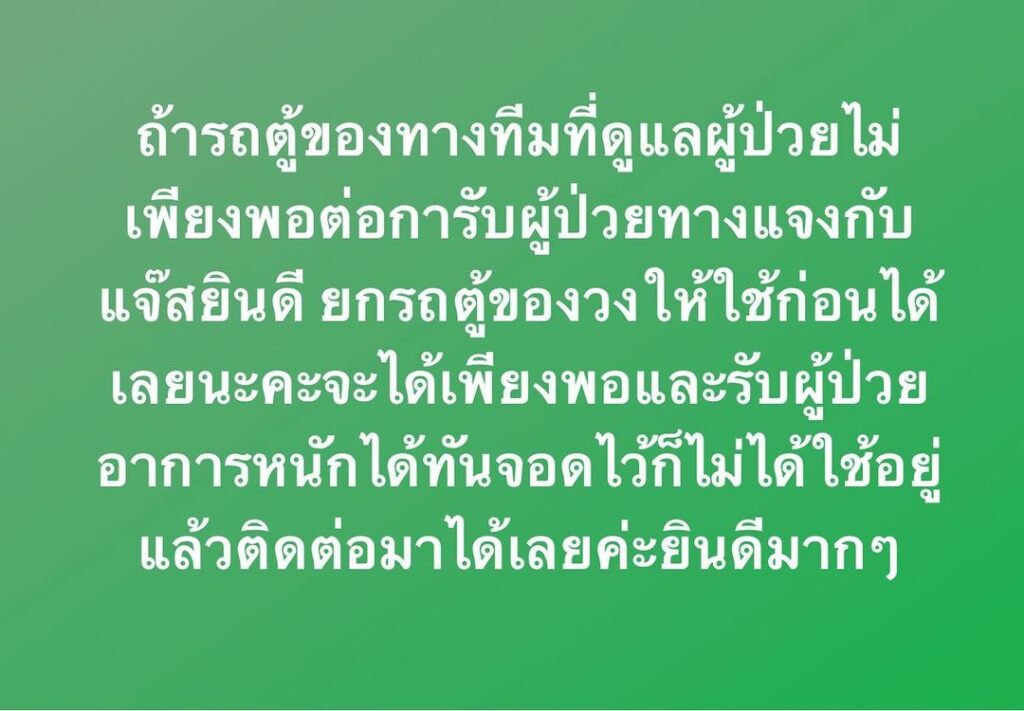“ถ้ารถตู้ของทางทีมที่ดูแลผู้ป่วยไม่เพียงพอต่อการรับผู้ป่วย ทางแจงกับแจ๊สยินดี ยกรถตู้ของวงให้ใช้ก่อนได้เลยนะคะ จะได้เพียงพอและรับผู้ป่วยอาการหนักได้ทัน จอดไว้ก็ไม่ได้อยู่แล้ว ติดต่อมาได้เลยค่ะยินดีมากๆ ทางโรงพยาบาล ไหนที่ขาดรบกวนติดต่อ ที่ผจก 0865006199 คุณบูม”