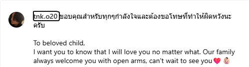 และ “ทีเค” ได้ระบุแคปชั่นว่า “ขอบคุณสำหรับทุกๆกำลังใจและต้องขอโทษที่ทำให้ผิดหวังนะครับ