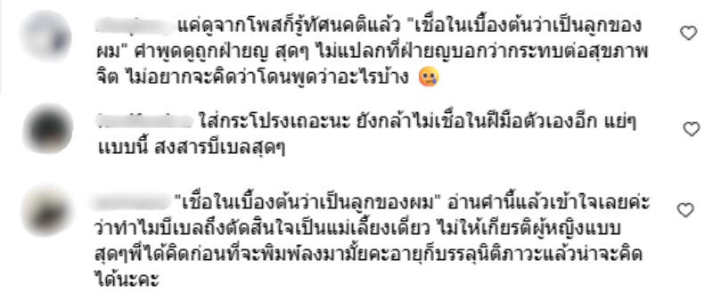 ซึ่งการชี้แจงนี้กลายเป็นว่าทำชาวเน็ตไม่พอใจมากกว่าเดิม และได้เข้ามาแสดงความคิดเห็นหลากหลาย อาทิ แค่ดูจากโพสก็รู้ทัศนคติแล้ว “เชื่อในเบื้องต้นว่าเป็นลูกของผม” คำพูดดูถูกฝ่ายญ สุดๆ ไม่แปลกที่ฝ่ายญบอกว่ากระทบต่อสุขภาพจิต ไม่อยากจะคิดว่าโดนพูดว่าอะไรบ้าง , ใส่กระโปรงเถอะนะ ยังกล้าไม่เชื่อในฝีมือตัวเองอีก แย่ๆเเบบนี้ สงสารบีเบลสุดๆ , “เชื่อในเบื้องต้นว่าเป็นลูกของผม” อ่านคำนี้แล้วเข้าใจเลยค่ะว่าทำไมบีเบลถึงตัดสินใจเป็นแม่เลี้ยงเดี่ยว ไม่ให้เกียรติผู้หญิงแบบสุดๆพี่ได้คิดก่อนที่จะพิมพ์ลงมามั้ยคะอายุก็บรรลุนิติภาวะแล้วน่าจะคิดได้นะคะ เป็นต้น
