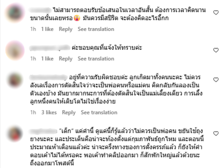 - โดยที่ผ่านมา ครอบครัวของเราทั้งสองฝ่ายได้มีการพูดคุยกันมาตลอดตั้งแต่วันที่ 2 มี.ค. 68 จนถึงวันที่ 5 พ.ค. 68 และทางครอบครัวของฝ่ายหญิงได้เสนอรายละเอียดเกี่ยวกับค่าใช้จ่ายในการเลี้ยงดูในฐานะแม่เลี้ยงเดี่ยว ตั้งแต่ค่าฝากครรภ์ ค่าคลอดค่าที่พักอาศัยของแม่และเด็ก ไปจนถึงค่าเล่าเรียนจนจบการศึกษาเป็นเงินจำนวนหนึ่งโดยข้อเสนอทั้งหมดข้างต้นผมไม่มีโอกาสและไม่มีส่วนร่วมในการตัดสินใจเรื่องการเลี้ยงดูเด็กเลยทำให้ไม่สามารถตอบรับข้อเสนอทั้งหมดได้ในทันที และยังอยู่ระหว่างการปรึกษากันเพื่อให้เกิดผลดีที่สุดกับทุกฝ่ายและเกิดผลกระทบกับแม่และเด็กให้น้อยที่สุด