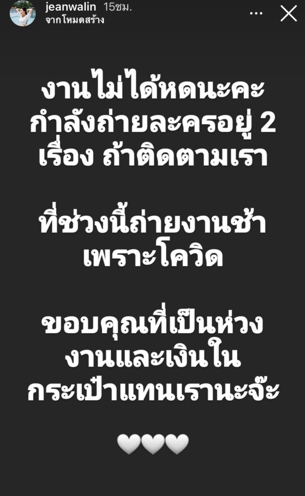 นอกจากนี้สาวยีนส์ ยังโพสต์ไอจีสตอรี่อีกว่า “งานไม่ได้หดนะคะ กำลังถ่ายละครอยู่ 2 เรื่อง ถ้าติดตามเรา ที่ช่วงนี้ถ่ายงานช้าเพราะโควิด ขอบคุณที่เป็นห่วงงานและเงินในกระเป๋าแทนเรานะจ๊ะ”