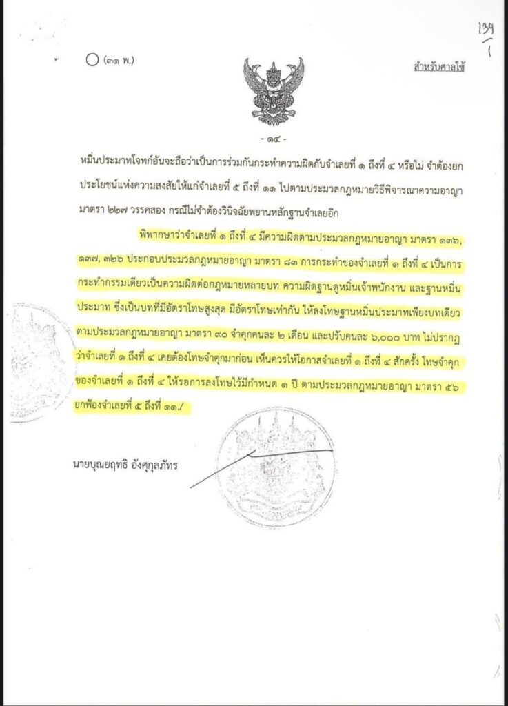 เมื่อวันที่ 26 สิงหาคม 2567 ศาลแขวงปทุมวัน ได้มีคำพิพากษาในคดีหมายเลขดำที่ อ.316/2566 คดีหมายเลขแดงที่ อ.809/2567 ว่า จำเลยทั้งสี่มีความผิดตามประมวลกฎหมายอาญา มาตรา 136 ,137 ,326 ให้ลงโทษจำคุกจำเลยคนละ 2 เดือน และปรับคนละ 6,000 บาท แต่ให้รอการลงโทษ 1 ปี และเมื่อวันที่ 3 กุมภาพันธ์ 2568 ศาลแขวงดุสิต ได้มีคำพิพากษาในคดีหมายเลขดำที่ อ.868/2566 คดีหมายเลขแดงที่ อ.124/2568 ว่า จำเลยทั้งสี่มีความผิดฐาน “แจ้งความเท็จ และหมิ่นประมาท” ให้ลงโทษจำคุกจำเลยคนละ 2 เดือน และปรับคนละ 6,000 บาท แต่ให้รอการลงโทษ 1 ปี