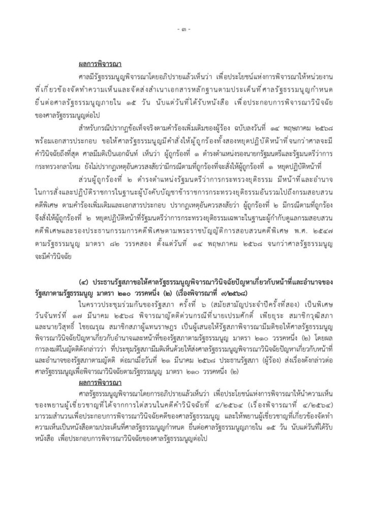 ผลการพิจารณา ศาลมีรัฐธรรมนูญพิจารณาโดยอภิปรายแล้วเห็นว่า เพื่อประโยชน์แห่งการพิจารณาให้หน่วยงานที่เกี่ยวข้องจัดทำความเห็นและจัดส่งสำเนาเอกสารหลักฐานตามประเด็นที่ ศาลรัฐธธรรมนูญ กำหนดยื่นต่อศาลรัฐธรรมนูญภายใน 15 วัน นับแต่วันที่ได้รับหนังสือ เพื่อประกอบการพิจารณาวินิจฉัยของศาลรัฐธรรมนูญต่อไป
