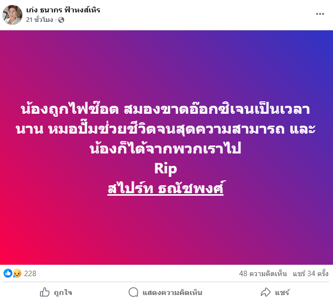 แต่ก็ต้องพบกับเรื่องน่าเศร้าเมื่อ “สไปร์ท ธณัชพงศ์” พิธีกรและหนึ่งในสมาชิกคณะหมอลำได้เสียชีวิตลงโดยผู้ใช้งาน Facebook “เก่ง ธนากร ฟ้าหงส์เหิร” ได้โพสต์ข้อความแจ้งให้ทราบว่า “น้องถูกไฟช๊อต สมองขาดอ๊อกซิเจนเป็นเวลานาน หมอปั๊มช่วยชีวิตจนสุดความสามารถ และน้องก็ได้จากพวกเราไป Rip สไปร์ท ธณัชพงศ์”