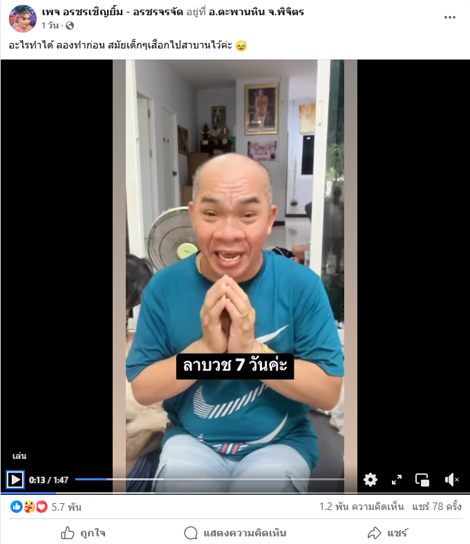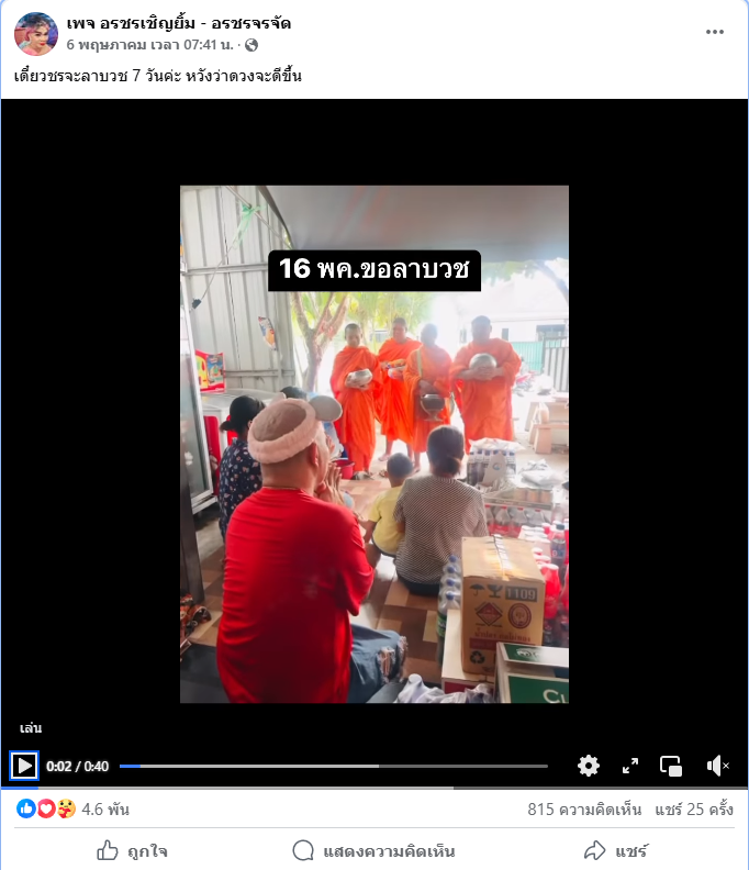 ขณะเดียวกันก็ได้โพสต์คลิปขณะกำลังฉันเพลบอกว่าตนบวชเป็นพระจริง ๆ ไม่ได้ถ่ายหนัง และขอบคุณโยมทุกคนที่ที่ทำกับข้าวมาให้ ซึ่งหลังจากโพสต์ได้ไม่นานเหล่าแฟนคลับก็เข้ามาร่วมอนุโมทนาบุญกันอย่างล้นหลาม