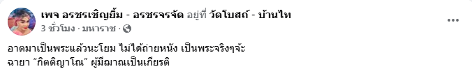 ซึ่งล่าสุด เพจ อรชรเชิญยิ้ม – อรชรจรจัด ได้โพสต์ภาพห่มจีวรพร้อมระบุแคปชั่นว่า “อาตมาเป็นพระแล้วนะโยม ไม่ได้ถ่ายหนัง เป็นพระจริงๆจ้ะ ฉายา “กิตติญาโณ” ผู้มีฌาณเป็นเกียรติ”