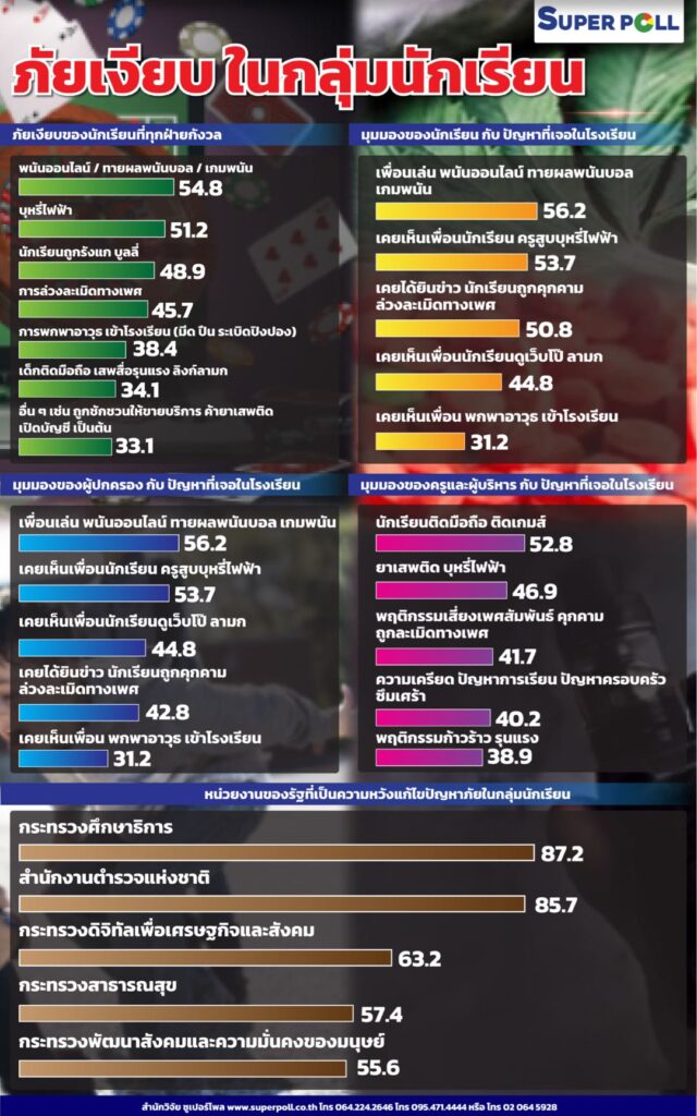 ผู้ช่วยศาสตราจารย์ ดร.นพดล กรรณิกา ผู้อำนวยการสำนักวิจัยซูเปอร์โพล เปิดเผยผลสำรวจเรื่อง “ภัยเงียบในกลุ่มนักเรียน” ที่จัดทำขึ้นระหว่างวันที่ 14 – 17 พฤษภาคม 2568 จากกลุ่มตัวอย่างประชาชนจำนวน 1,525 ราย แบ่งเป็นนักเรียนมัธยมศึกษา 625 คน ผู้ปกครอง 525 คน และคณะครูและผู้บริหารโรงเรียน จำนวน 375 คน พบว่า “พนันออนไลน์” คือ ภัยเงียบอันดับหนึ่งที่ทุกกลุ่มกังวลมากที่สุด ด้วยร้อยละ 54.8 สะท้อนว่าการเข้าถึงแพลตฟอร์มการพนันในหมู่นักเรียนไม่ใช่เรื่องใหม่ แต่เป็น “พฤติกรรมซ้ำซ้อน” ที่ฝังอยู่ในชีวิตประจำวันของเด็กจำนวนมาก การเปลี่ยนมือถือให้เป็น “โต๊ะพนันในมือ” ได้ตลอด 24 ชั่วโมง คือ สัญญาณอันตรายว่าโรงเรียนกำลังถูกแทรกแซงด้วยอุตสาหกรรมพนันที่เจาะเข้าถึงเยาวชนโดยตรงอันดับรองลงมา ได้แก่ บุหรี่ไฟฟ้า ร้อยละ 51.2 การถูกรังแกหรือบูลลี่ ร้อยละ 48.9 การล่วงละเมิดทางเพศ ร้อยละ 45.7 การพกพาอาวุธ เช่น มีด ปืน ระเบิดปิงปอง ร้อยละ 38.4 การเสพสื่อรุนแรง/ลามก ร้อยละ 34.1 ภัยแฝง เช่น การถูกชักชวนค้าประเวณีหรือค้ายา ร้อยละ 33.1 สิ่งนี้สะท้อนชัดว่า “ภัยเงียบในโรงเรียน” ไม่ได้มีเพียงเรื่องการเรียน แต่ยังพัวพันกับ พฤติกรรมผิดกฎหมาย ความรุนแรง และปัญหาทางเพศ ที่ขยายตัวลึกในโรงเรียนโดยไม่มีระบบคัดกรองที่ทันสมัยเพียงพอ