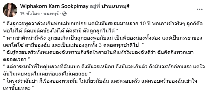 “ หากชาติหน้ามีจริง ลูกขอเกิดเป็นลูกของพ่อกับแม่ เป็นพี่ของน้องทั้งสอง และเป็นภรรยาของเสกโลโซ สามีของฉัน และเป็นแม่ของลูกทั้ง 3 ตลอดทุกชาติไป “