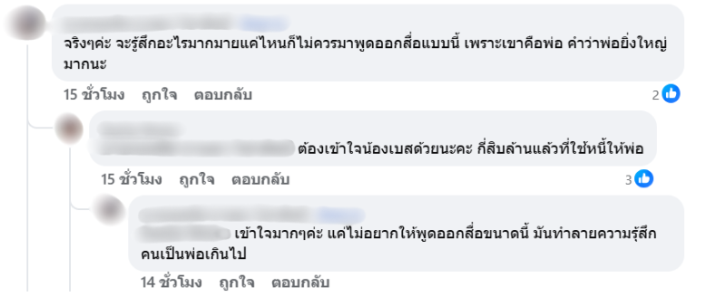 หลังจากโพสต์ถูกเผยแพร่ไปชาวเน็ตก็ได้เข้ามาแสดงความคิดเห็นหลากหลายมุมมอง อาทิ จริงๆค่ะ จะรู้สึกอะไรมากมายแค่ไหนก็ไม่ควรมาพูดออกสื่อแบบนี้ เพราะเขาคือพ่อ คำว่าพ่อยิ่งใหญ่มากนะ , ต้องเข้าใจน้องเบสด้วยนะคะ กี่สิบล้านแล้วที่ใช้หนี้ให้พ่อ , เข้าใจมากๆค่ะ แค่ไม่อยากให้พูดออกสื่อขนาดนี้ มันทำลายความรุ้สึกคนเป็นพ่อเกินไป เป็นต้น