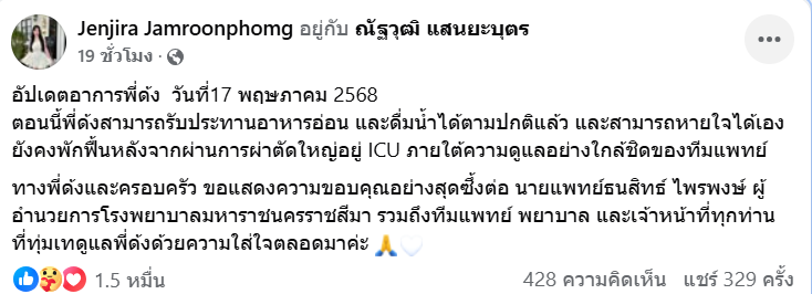 ทางพี่ด้งและครอบครัว ขอแสดงความขอบคุณอย่างสุดซึ้งต่อ นายแพทย์ธนสิทธ์ ไพรพงษ์ ผู้อำนวยการโรงพยาบาลมหาราชนครราชสีมา รวมถึงทีมแพทย์ พยาบาล และเจ้าหน้าที่ทุกท่าน ที่ทุ่มเทดูแลพี่ด้งด้วยความใส่ใจตลอดมาค่ะ ”