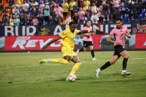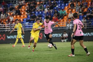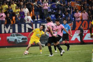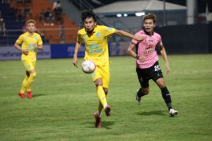 นาทีที่ 38 ธีราทร บุญมาทัน เปิดบอลยาวจากแดนหลังขึ้นหน้า ณฐกร รัตนสุวรรณ สปีดตามไปเก็บบอลได้ในกรอบเขตโทษก่อนจะลากจี้เข้าไปยิงด้วยขวา ทว่าแนวรับวิ่งตามมาจากด้านหลังล้มตัวบล็อกบอลออกหลังไปได้