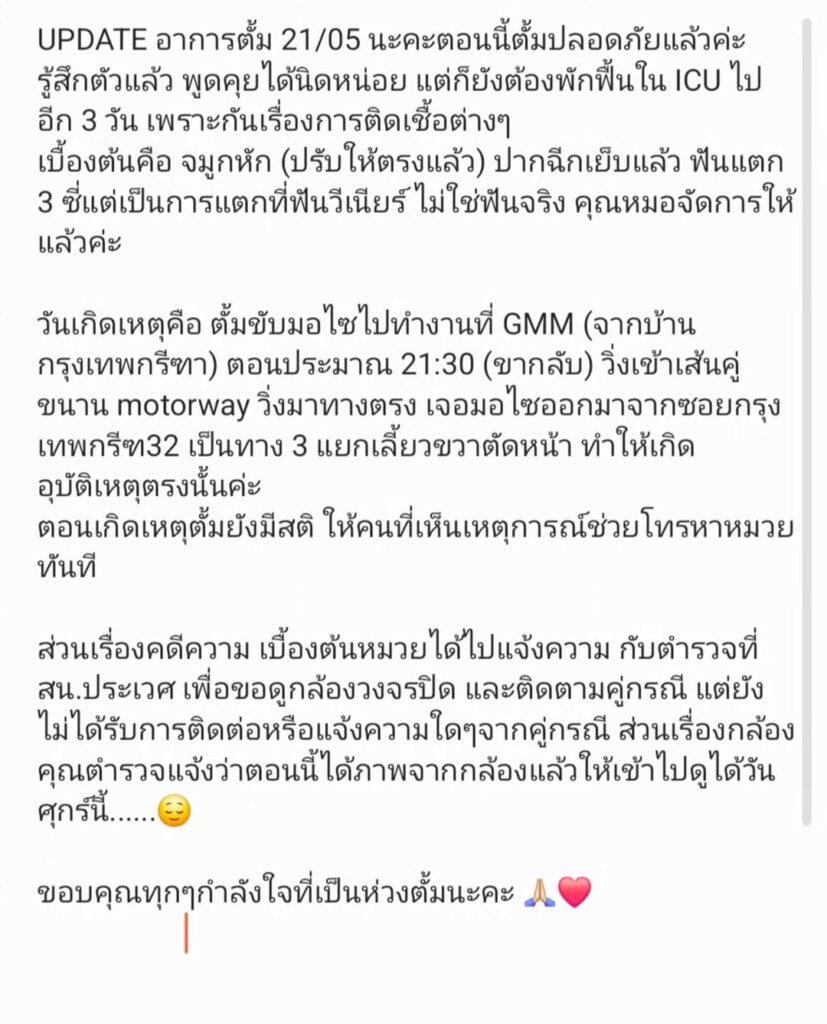 ล่าสุดผู้จัดการของ “ตั้ม” ได้ออกมาโพสต์อัปเดตอาการว่า พร้อมเล่าถึงวันที่เกิดอุบัติเหตุว่า “UPDATE อาการตั้ม 21/05 นะคะ ตอนนี้ตั้มปลอดภัยแล้วค่ะ รู้สึกตัวแล้ว พูดคุยได้นิดหน่อย แต่ก็ยังต้องพักฟื้นใน ICU ไป อีก 3 วัน เพราะกันเรื่องการติดเชื้อต่างๆ