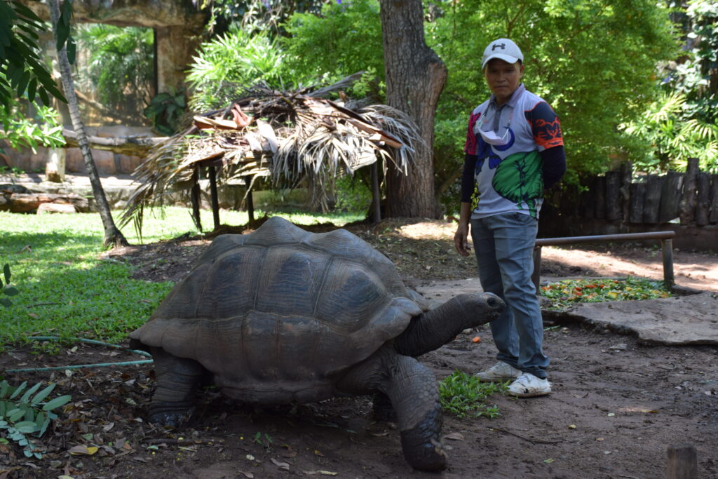 ซึ่งนายสุนทร จองกลาง หัวหน้างานบำรุงสัตว์เลื้อยคลาน กล่าวว่า “สำหรับเต่ายักษ์อัลดาบรา เป็นเต่าบกที่มีขนาดใหญ่ เป็นอันดับ 2 ของโลก รองจากเต่ายักษ์กาลาปากอส โดยมีถิ่นกำเนิดอยู่ที่เกาะ Aldabar ซึ่งเป็นหนึ่งในเกาะเซเชลส์ ทางตะวันออกเฉียงเหนือของมาดากัสการ์ ลำตัวมีความยาวมากกว่าหนึ่งเมตร เกล็ดกระดองหนาเป็นรูปโดมสีเทาเข็มจนถึงดำ มีน้ำหนักตัวได้ถึง 250 กิโลกรัม และมีอายุยืนยาวได้ถึง 150 ปี ส่วนอาหารหลัก จะเป็นหญ้า ผลไม้ พืชสมุนไพร และใบไม้ เป็นต้น สำหรับฤดูผสมพันธุ์ จะอยู่ในช่วงเดือนกุมภาพันธ์ – พฤษภาคม และออกไข่ครั้งละประมาณ 9 – 25 ฟอง