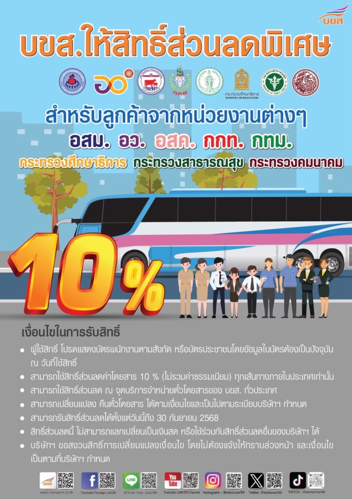 บขส.ย้ำ ผู้ถือบัตรสวัสดิการแห่งรัฐใช้สิทธิ์ค่าเดินทาง 750 บาท ซื้อตั๋ว บขส. ได้ทุกเส้นทาง – 8 กลุ่มพันธมิตร รับส่วนลดค่าโดยสาร 10% วันนี้ – 30 ก.ย.68 หนุนเดินทางด้วยระบบขนส่งสาธารณะ