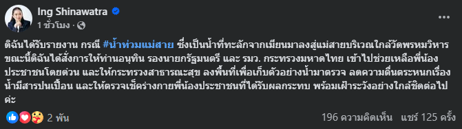 น.ส.แพทองธาร ชินวัตร นายกรัฐมนตรี โพสต์ข้อความผ่านเฟซบุ๊ค “Ing Shinawatra” ว่า ดิฉันได้รับรายงาน กรณี #น้ำท่วมแม่สาย ซึ่งเป็นน้ำที่ทะลักจากเมียนมา ลงสู่แม่สายบริเวณใกล้วัดพรหมวิหาร ขณะนี้ดิฉันได้สั่งการให้ท่านอนุทิน รองนายกรัฐมนตรี และ รมว. กระทรวงมหาดไทย เข้าไปช่วยเหลือพี่น้องประชาชนโดยด่วน และให้กระทรวงสาธารณะสุข ลงพื้นที่เพื่อเก็บตัวอย่างน้ำมาตรวจ ลดความตื่นตระหนกเรื่องน้ำมีสารปนเปื้อน และให้ตรวจเช็คร่างกายพี่น้องประชาชนที่ได้รับผลกระทบ พร้อมเฝ้าระวังอย่างใกล้ชิดต่อไป