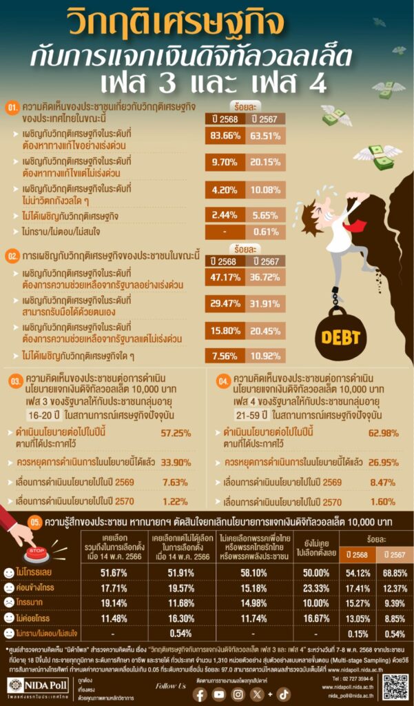 ศูนย์สำรวจความคิดเห็น “นิด้าโพล” สถาบันบัณฑิตพัฒนบริหารศาสตร์ (นิด้า) เปิดเผยผลการสำรวจเรื่อง “วิกฤติเศรษฐกิจกับการแจกเงินดิจิทัลวอลเล็ต เฟส 3 และ เฟส 4” โดยทำการสำรวจระหว่างวันที่ 7-8 พฤษภาคม 2568 จากประชาชนที่มีอายุ 18 ปีขึ้นไปทั่วประเทศ รวมจำนวนทั้งสิ้น 1,310 หน่วยตัวอย่าง เกี่ยวกับวิกฤติเศรษฐกิจกับการแจกเงินดิจิทัลวอลเล็ต 10,000 บาท พบว่า จากการสำรวจเมื่อถามความคิดเห็นของประชาชนเกี่ยวกับวิกฤติเศรษฐกิจของประเทศไทยในขณะนี้ ตัวอย่าง ร้อยละ 83.66 ระบุว่า เผชิญกับวิกฤติเศรษฐกิจในระดับที่ต้องหาทางแก้ไขอย่างเร่งด่วน รองลงมา ร้อยละ 9.70 ระบุว่า เผชิญกับวิกฤติเศรษฐกิจในระดับที่ต้องหาทางแก้ไขแต่ไม่เร่งด่วน ร้อยละ 4.20 ระบุว่า เผชิญกับวิกฤติเศรษฐกิจในระดับที่ไม่น่าวิตกกังวลใด ๆ และร้อยละ 2.44 ระบุว่า ไม่ได้เผชิญกับวิกฤติเศรษฐกิจ