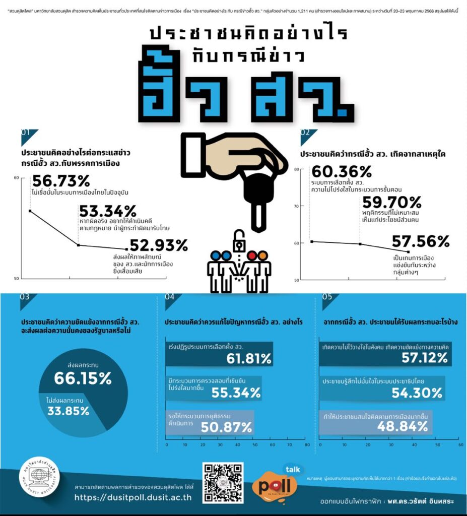 “สวนดุสิตโพล” มหาวิทยาลัยสวนดุสิต สำรวจความคิดเห็นประชาชนทั่วประเทศที่สนใจติดตามข่าวการเมือง เรื่อง “ประชาชนคิดอย่างไร กับ กรณีข่าวฮั้ว สว.”กลุ่มตัวอย่างจำนวน 1,211 คน โดยทำการสำรวจทางออนไลน์และภาคสนาม ระหว่างวันที่ 20-23 พฤษภาคม 2568 โดยเมื่อถามประชาชนคิดอย่างไรต่อกระแสข่าว กรณีฮั้ว สว.กับพรรคการเมือง พบว่า ร้อยละ 56.73 ไม่เชื่อมั่นในระบบการเมืองไทยในปัจจุบัน ร้อยละ 53.34 หากผิดจริง อยากให้ดำเนินคดีตามกฎหมาย นำผู้กระทำผิดมารับโทษ และร้อยละ 52.93 ส่งผลให้ภาพลักษณ์ของ สว.และนักการเมืองยิ่งเสื่อมเสีย