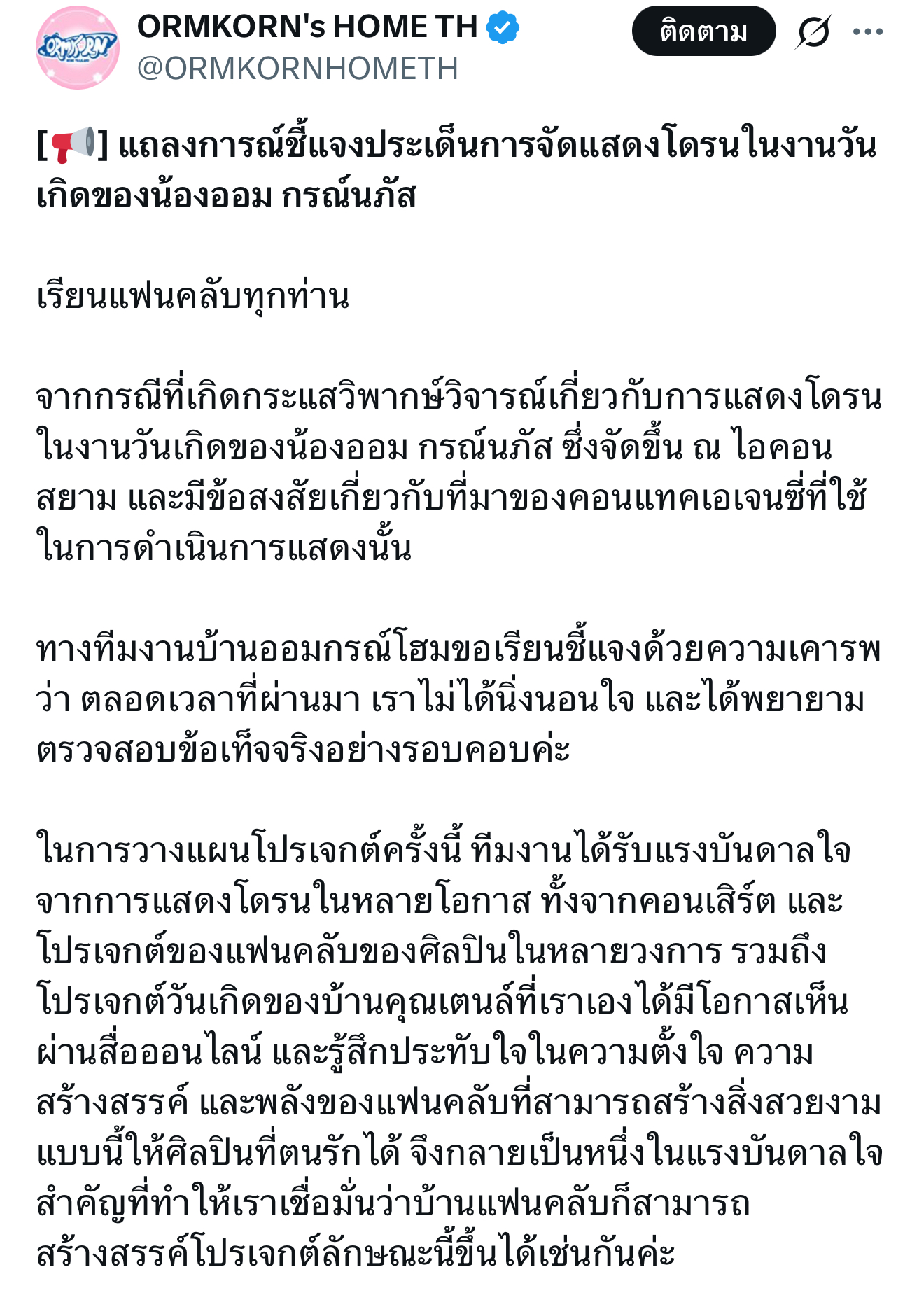 ล่าสุดทางด้านด้อม ”ออม“ ได้ออกมาชี้แจงอีกครั้ง โดยการโพสต์ข้อความว่า ”แถลงการณ์ชี้แจงประเด็นการจัดแสดงโดรนในงานวันเกิดของน้องออม กรณ์นภัส