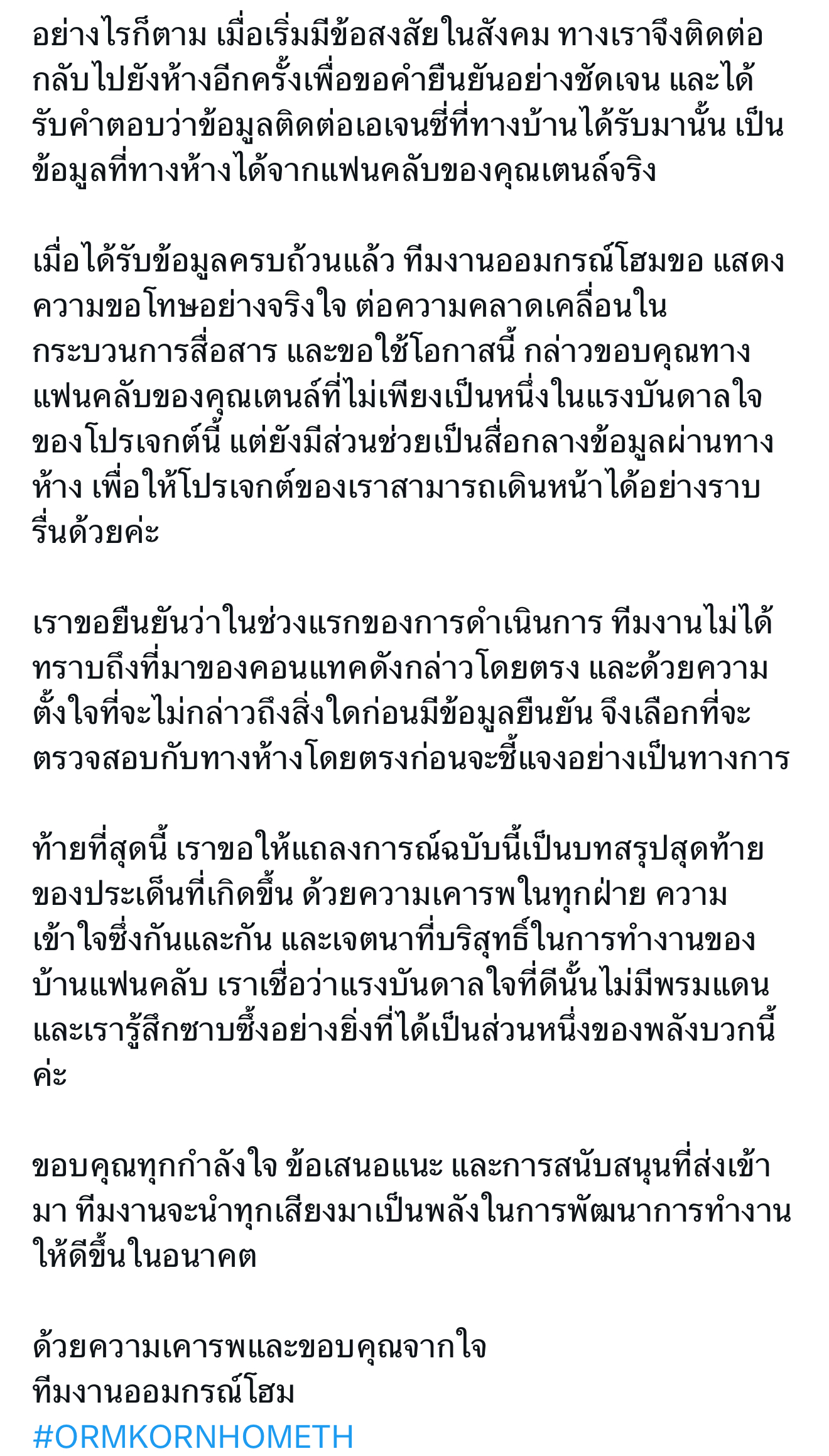 เมื่อได้รับข้อมูลครบถ้วนแล้ว ทีมงานออมกรณ์โฮมขอ แสดงความขอโทษอย่างจริงใจ ต่อความคลาดเคลื่อนในกระบวนการสื่อสาร และขอใช้โอกาสนี้ กล่าวขอบคุณทางแฟนคลับของคุณเตนล์ที่ไม่เพียงเป็นหนึ่งในแรงบันดาลใจของโปรเจกต์นี้ แต่ยังมีส่วนช่วยเป็นสื่อกลางข้อมูลผ่านทางห้าง เพื่อให้โปรเจกต์ของเราสามารถเดินหน้าได้อย่างราบรื่นด้วยค่ะ