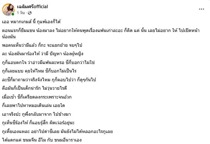 หลังจากนั้น “มิกซ์” ก็ได้มาโพสต์ว่า “เออ หมากเกมส์ นี้ กูแพ้เองก็ได้ ตอนแรกก็ยืมแขน น้องมาลง ไม่อยากให้คนพูดเรื่องแฟนเก่าละอะ ก็คิด แค่ นั้น เลยไม่อยาก ให้ ไปเปิดหน้า น้องมันพอคนเห็นว่ามีแล้ว ก็กะ จะแยกย้าย จบๆไปละ น้องมันมาร้องไห้ ว่ามี ปัญหา น้องผู้หญิงกูก็แอบตกใจ ว่าอ่าวมีแฟนละหรอ ชีก็บอกว่าไม่ใช่กูก็เลยแบบ คุยให้ไหม ชีก็บอกไม่เป็นไร ละชีก็มาถามว่าจริงจังไหม กูก็ตอบไปว่า ก็ดูๆกันไป คือมันก็เป็นเด็กน่ารัก ไม่วุ่นวายไรดี เมื่อเช้า ชีก็เครียดลงกระเพราะจนอ้วก ก็เลยพาไปหาหมอเดินเล่น เอยใด เอาจริงปะ กูพึ่งกลับมาจาก ไปข้างมา กูเห็นชีร้องไห้ ก็แอบรู้สึก ผิดเว่อร์อยู่นะ กูเหี้ยเองแหละ อย่าไปด่าชีเลย มันยังไม่ได้หลอกอะไรกูเลย ได้แดกแค่ ขนมจีน อีโม กับ ขนมอีนาราเอง”