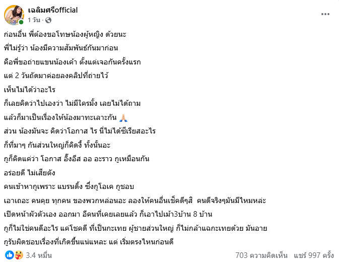 และล่าสุดเจ้าตัวก็ได้โพสต์ว่า “ก่อนอื่น พี่ต้องขอโทษน้องผู้หญิง ด้วยนะ พี่ไม่รู้ว่า น้องมีความสัมพันธ์กันมาก่อน คือพี่ขอถ่ายแขนน้องเค้า ตั้งแต่เจอกันครั้งแรก แต่ 2 วันถัดมาค่อยลงคลิปที่ถ่ายไว้ เห็นไม่ได้ว่าอะไร ก็เลยคิดว่าไปเองว่า ไม่มีใครมั้ง เลยไม่ได้ถาม แล้วก็มาเป็นเรื่องให้น้องมาทะเลาะกัน ส่วน น้องมันจะ คิดว่าโอกาส ไร นี่ไม่ได้ซีเรียสอะไร ก็ที่มาๆ กันส่วนใหญ่ก็คิดงี้ ทั้งนั้นอะ กูก็คิดแค่ว่า โอกาส อิ๊งอีส ออ อะราว กูเหมือนกัน อร่อยดี ไม่เสียตัง คนเข้าหากูเพราะ แบรนดิ้ง ซึ่งกูโอเค กูชอบเอาเถอะ คนคุย ทุกคน ของพวกหล่อนอะ ลองให้คนอื่นเช็คดีๆสิ คนดีจริงๆมันมีไหมหล่ะ เปิดหน้าผัวตัวเอง ออกมา อีคนที่เคยเลยแล้ว ก็เอาไปเม้า3บ้าน 8 บ้าน กูก็ไม่ใช่คนดีอะไร แค่โชคดี ที่เป็นกะเทย ผู้ชายส่วนใหญ่ ก็ไม่กล้าแฉกะเทยด้วย มันอาย กูรับผิดชอบเรื่องที่เกิดขึ้นแน่แหละ แต่ เริ่มตรงไหนก่อนดี”