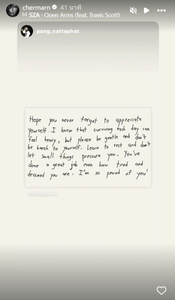 ล่าสุด “พลอย” ได้แชร์สตอรี่จากน้องสนิทที่เขียนให้เธอ โดยข้อความระบุว่า “Hope you never foget to appreciate yourself.   know that surviving each day can feel heavy, but please be gentle and don’t be harsh to yourself . Learm to rest and don’t  let small things presure you. You’ ve done a great job even how tired and drained you are. I’m so proud of you” ซึ่งแปลเป็นไทยได้ว่า “หวังว่าคุณจะไม่ลืมที่จะเห็นคุณค่าในตัวเอง รู้ว่าการต้องรับมือกับแต่ละวันมันรู้สึกหนักหน่วงได้ แต่ได้โปรดอ่อนโยนกับตัวเองบ้าง และอย่าใจร้ายกับตัวเองเลย เรียนรู้ที่จะพักผ่อน และอย่าปล่อยให้เรื่องเล็กน้อยมากดดันคุณมากเกินไป คุณทำได้ดีมากแล้วนะ ไม่ว่าคุณจะเหนื่อยล้าหรือหมดแรงแค่ไหนก็ตาม ฉันภูมิใจในตัวคุณมากๆ เลย”