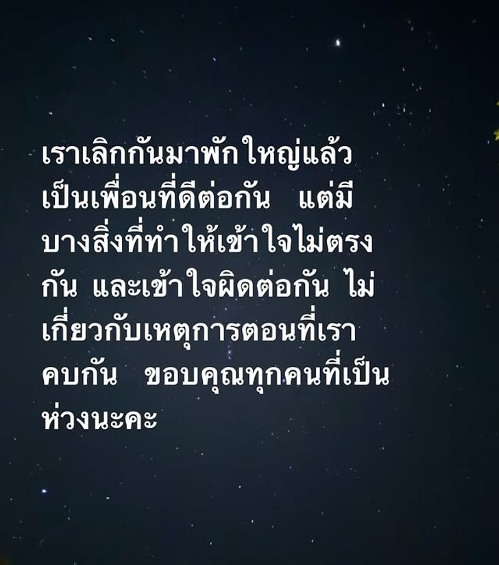 และอีกหนึ่งโพสต์ที่ระบุข้อความว่า “เราเลิกกันมาสักพักใหญ่แล้วเป็นเพื่อนที่ดีต่อกัน แต่มีบางสิ่งที่ทำให้เข้าใจไม่ตรงกันและเข้าใจผิดต่อกัน ไม่เกี่ยวกับเหตุการณ์ตอนที่เราคบกัน ขอบคุณทุกคนที่เป็นห่วงนะคะ”