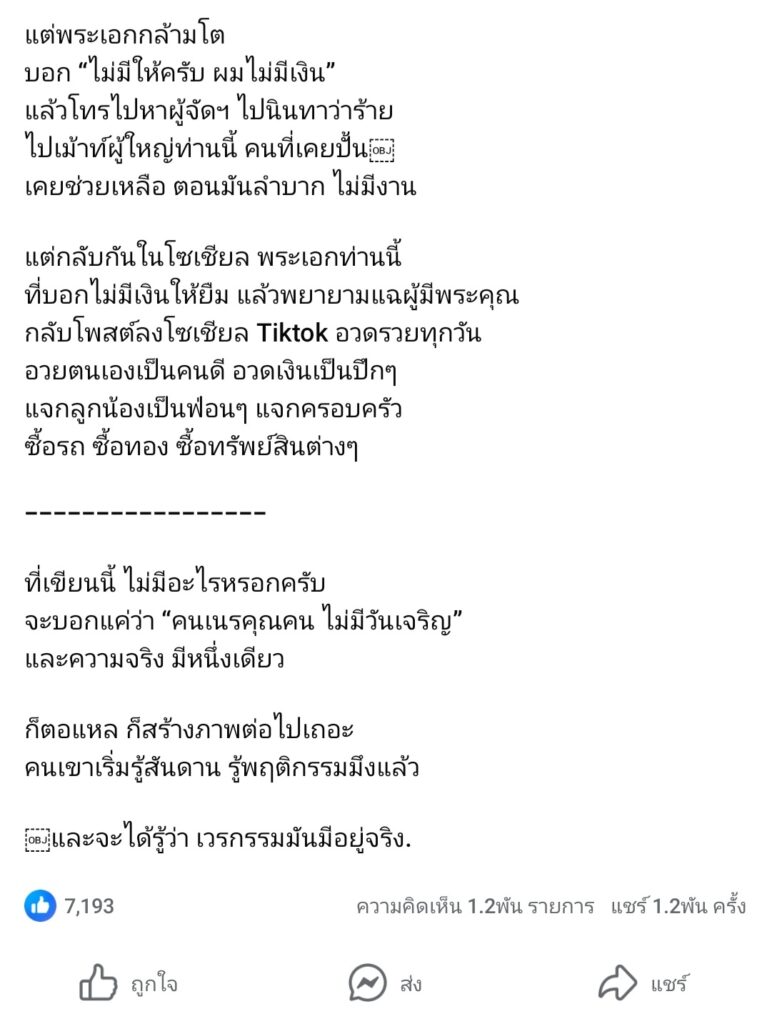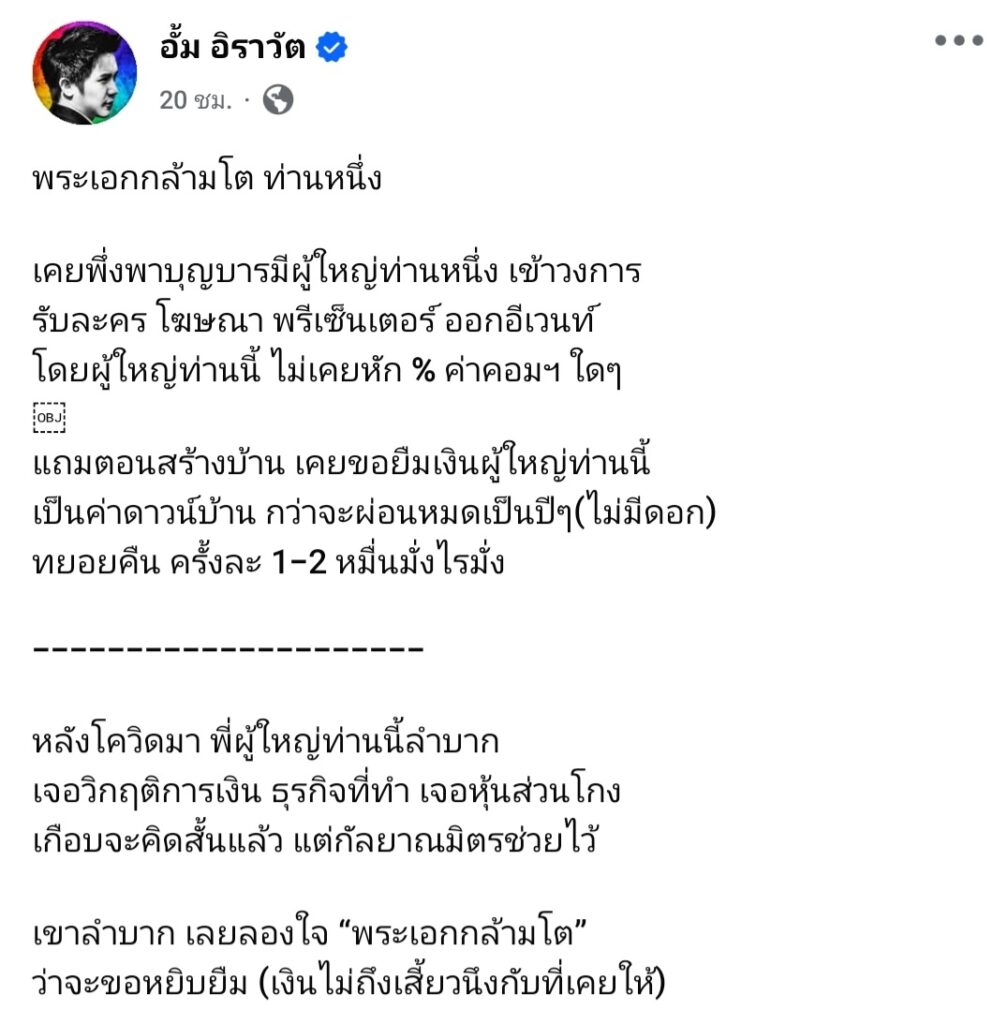หลังโควิดมา พี่ผู้ใหญ่ท่านนี้ลำบากเจอวิกฤติการเงิน ธุรกิจที่ทำ เจอหุ้นส่วนโกงเกือบจะคิดสั้นแล้ว แต่กัลยาณมิตรช่วยไว้ เขาลำบาก เลยลองใจ “พระเอกกล้ามโต” ว่าจะขอหยิบยืม (เงินไม่ถึงเสี้ยวนึงกับที่เคยให้) แต่พระเอกกล้ามโตบอก “ไม่มีให้ครับ ผมไม่มีเงิน” แล้วโทรไปหาผู้จัดฯ ไปนินทาว่าร้าย ไปเม้าท์ผู้ใหญ่ท่านนี้ คนที่เคยปั้น เคยช่วยเหลือ ตอนมันลำบาก ไม่มีงาน