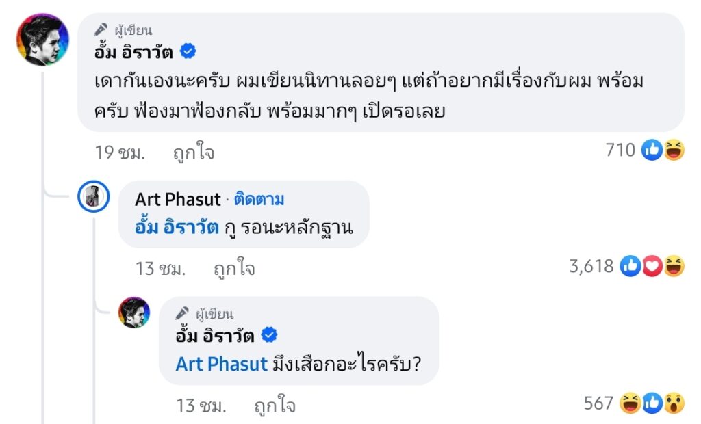 และได้โพสต์เดือดฟาด “อั้มอยู่เรื่อย ๆ ซึ่งทางด้าน “อั้ม” ยังไม่ได้ออกมาโพสต์โต้ตอบใด ๆ อีก และ “อาร์ต” ได้โพสต์รูปของตัวเองพร้อมระบุข้อความว่า “จำไว้นะ อั้ม อิราวัต เผื่อมึงไม่รู้ #ไอ้หมอเตี้ยเพราะกูสูง184หวะ #พระเอกกล้ามโตคือใคร #กูไม่จบ”