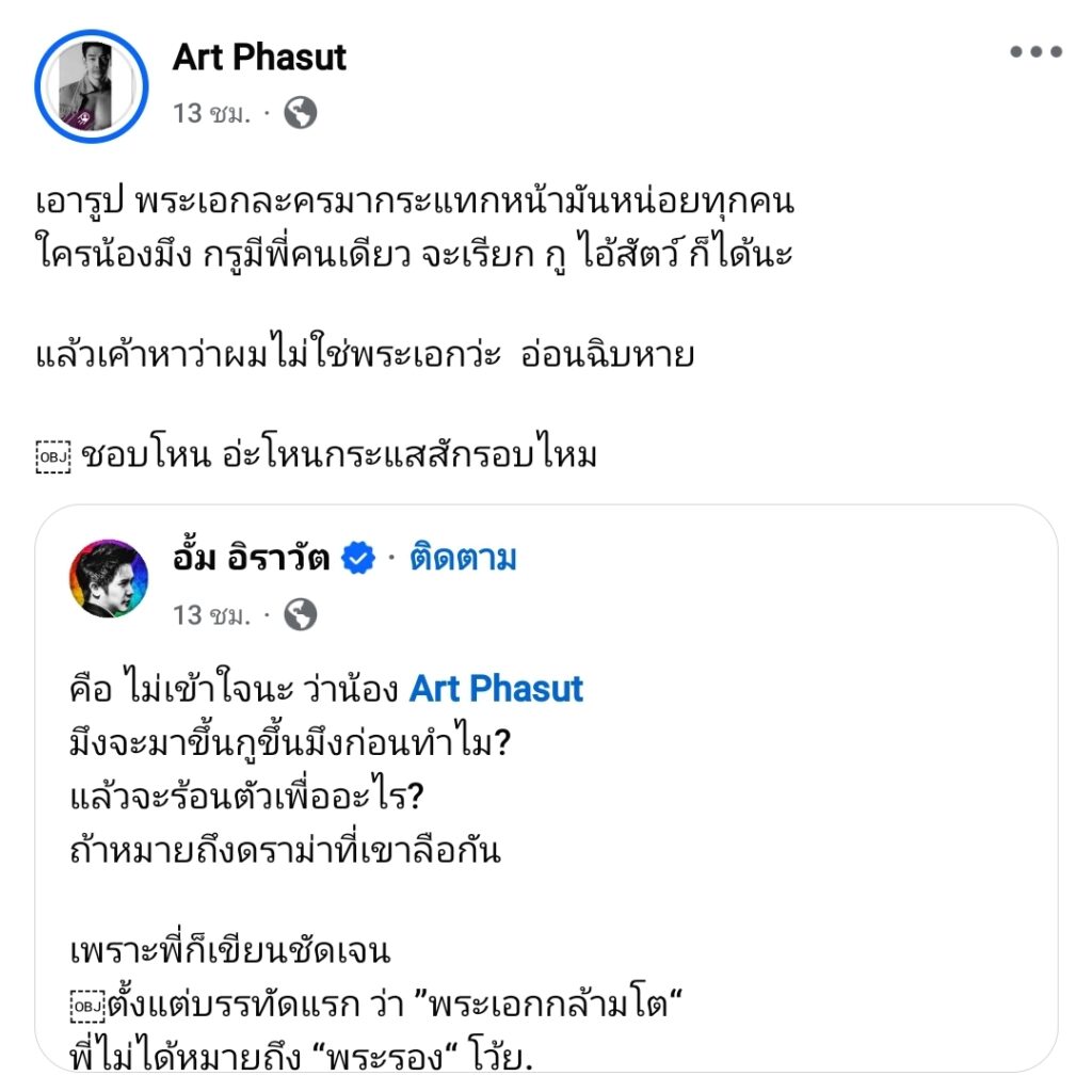 ซึ่ง “อาร์ต” ก็ได้แชร์โพสต์นี้และเขียนข้อความว่า “เอารูป พระเอกละครมากระแทกหน้ามันหน่อยทุกคน ใครน้องมึง กรูมีพี่คนเดียว จะเรียก กู ไอ้สัตว์ ก็ได้นะ แล้วเค้าหาว่าผมไม่ใช่พระเอกว่ะ อ่อนฉิบหาย ชอบโหน อ่ะโหนกระแสสักรอบไหม”
