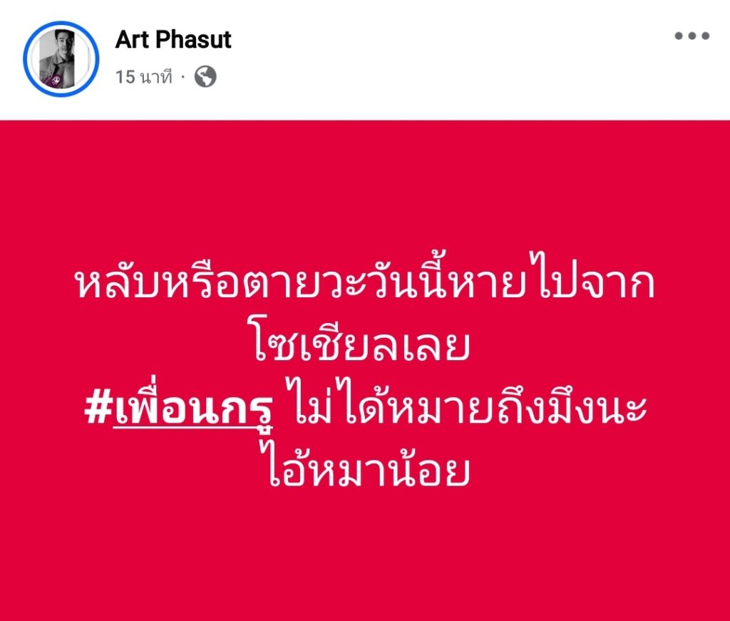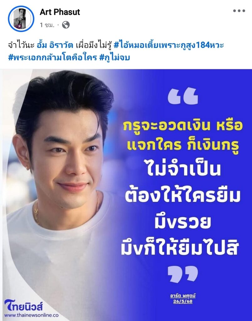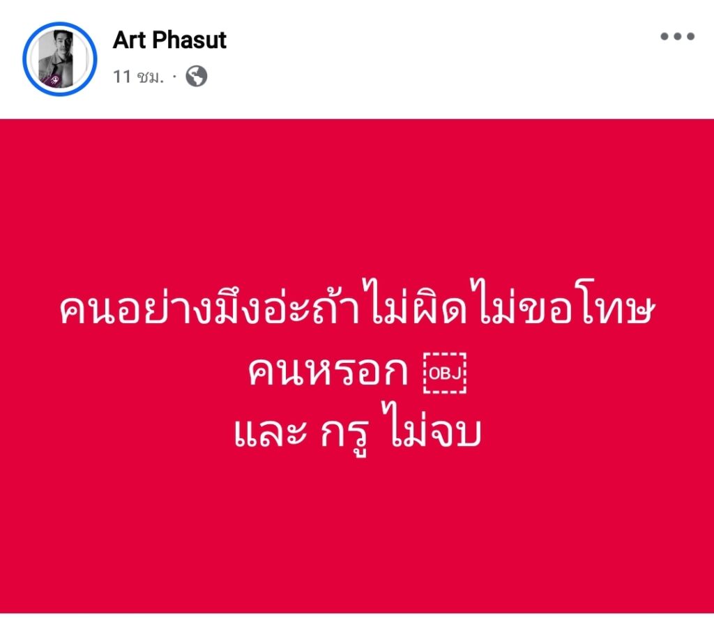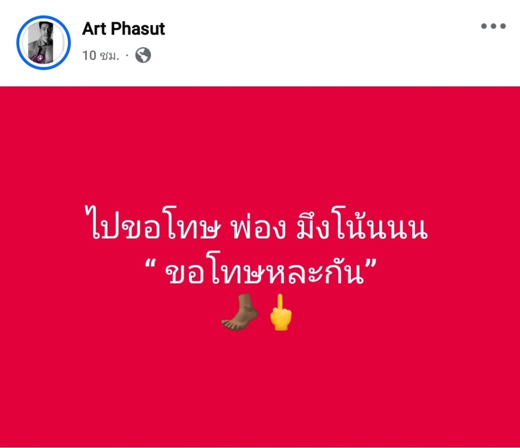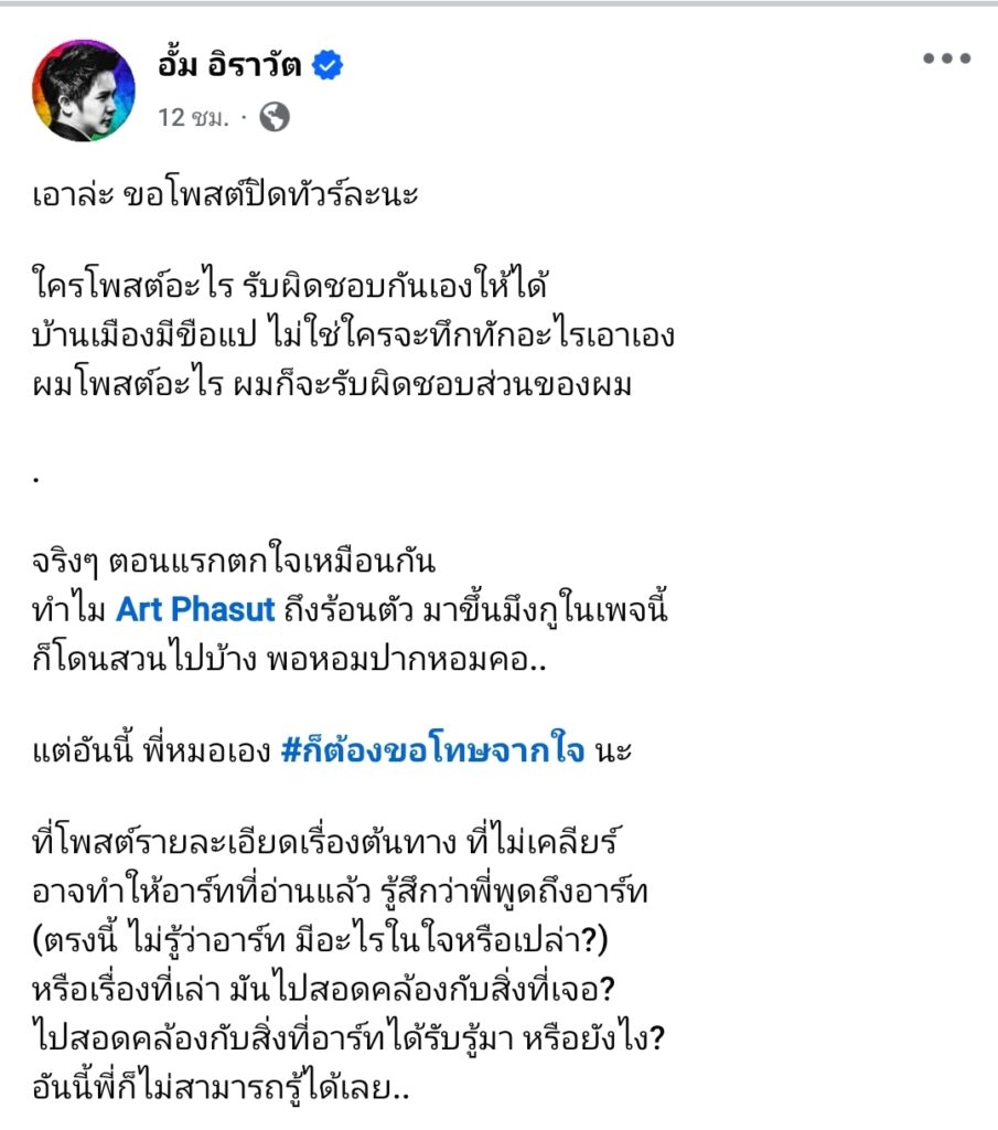 ใครโพสต์อะไร รับผิดชอบกันเองให้ได้ บ้านเมืองมีขือแป ไม่ใช่ใครจะทึกทักอะไรเอาเอง ผมโพสต์อะไร ผมก็จะรับผิดชอบส่วนของผม จริงๆ ตอนแรกตกใจเหมือนกัน ทำไม Art Phasut ถึงร้อนตัว มาขึ้นมึงกูในเพจนี้ ก็โดนสวนไปบ้าง พอหอมปากหอมคอ.. แต่อันนี้ พี่หมอเอง #ก็ต้องขอโทษจากใจ นะ ที่โพสต์รายละเอียดเรื่องต้นทาง ที่ไม่เคลียร์ อาจทำให้อาร์ทที่อ่านแล้ว รู้สึกว่าพี่พูดถึงอาร์ท (ตรงนี้ ไม่รู้ว่าอาร์ท มีอะไรในใจหรือเปล่า?) หรือเรื่องที่เล่า มันไปสอดคล้องกับสิ่งที่เจอ? ไปสอดคล้องกับสิ่งที่อาร์ทได้รับรู้มา หรือยังไง? อันนี้พี่ก็ไม่สามารถรู้ได้เลย..