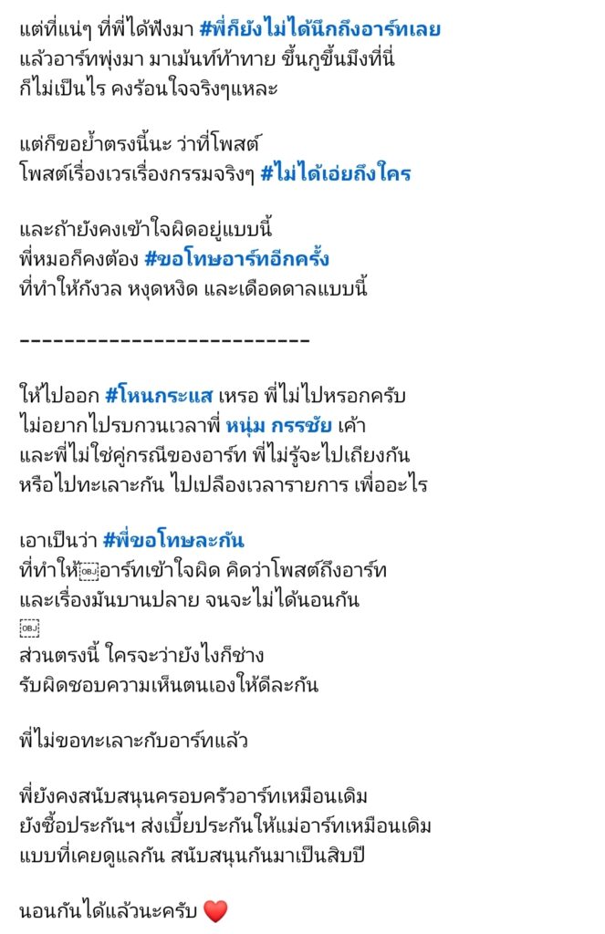 ส่วนตรงนี้ ใครจะว่ายังไงก็ช่าง รับผิดชอบความเห็นตนเองให้ดีละกัน พี่ไม่ขอทะเลาะกับอาร์ทแล้ว พี่ยังคงสนับสนุนครอบครัวอาร์ทเหมือนเดิม ยังซื้อประกันฯ ส่งเบี้ยประกันให้แม่อาร์ทเหมือนเดิม แบบที่เคยดูแลกัน สนับสนุนกันมาเป็นสิบปี นอนกันได้แล้วนะครับ ❤️”