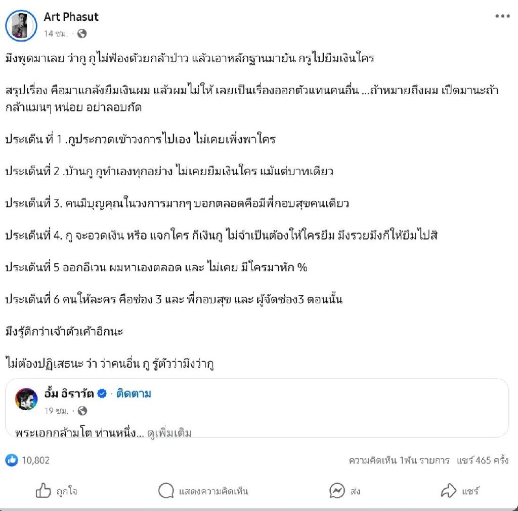 “เลยไม่รู้จะให้สัมภาษณ์อะไรจริงๆ คือ ไม่รู้ว่าใครอยากให้เป็นอาร์ทให้ได้ ก็ไม่เป็นไรครับ ผมก็งงเหมือนกัน เพราะที่ผมรู้ข้อมูลมา ผมก็ไม่ได้นึกถึงอาร์ทเลย และย้ำว่าที่ #ผมขอโทษอาร์ท เพราะเห็นเขาร้อนใจมาก ทุกคนคงดูออก ว่าเขาคงเครียดมาก กระทบเขา คิดว่าที่ผมโพสต์ เป็นตัวเขา จะให้เป็นให้ได้