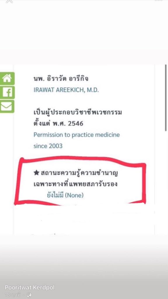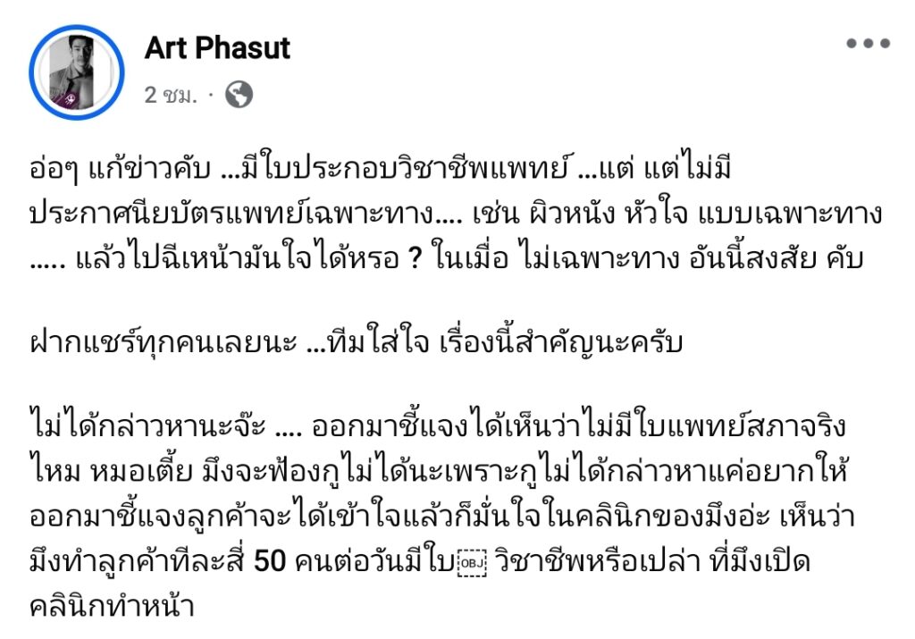 ทางด้าน “อาร์ต” ก็ได้ออกมาโพสต์เรื่อย ๆ โดยแนบรูปข้อมูลของทางแพทย์สภาพร้อมข้อความว่า “อ่อๆ แก้ข่าวคับ …มีใบประกอบวิชาชีพแพทย์ …แต่ แต่ไม่มีประกาศนียบัตรแพทย์เฉพาะทาง…. เช่น ผิวหนัง หัวใจ แบบเฉพาะทาง ….. แล้วไปฉีเหน้ามันใจได้หรอ ? ในเมื่อ ไม่เฉพาะทาง อันนี้สงสัย คับ