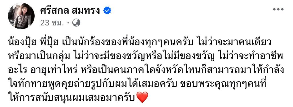 เรียกว่าช่วงนี้ออกมาตัดพ้อบ่อยตั้งแต่สถานะโสด สำหรับนักร้องหนุ่ม “ปุ้ย L. กฮ. ที่แฟนคลับต่างส่งกำลังใจให้อยู่บ่อยๆ จะเห็นว่าช่วงนี้เจ้าตัวทุ่มเทกับงานเพลงและทัวร์คอนเสิร์ต ล่าสุดเจ้าตัวก็ออมาโพสต์คลิปตัวเอง ด้วยสีหน้าที่ค่อยๆยิ้ม พร้อมแคปชั่นว่า “น้องปุ้ย พี่ปุ้ย เป็นนักร้องของพี่น้องทุกๆคนครับ ไม่ว่าจะมาคนเดียวหรือมาเป็นกลุ่ม ไม่ว่าจะมีของขวัญหรือไม่มีของขวัญ ไม่ว่าจะทำอาชีพอะไร อายุเท่าไหร่ หรือเป็นคนภาคใดจังหวัดไหนก็สามารถมาให้กำลังใจทักทายพูดคุยถ่ายรูปกับผมได้เสมอครับ ขอบพระคุณทุกๆคนที่ให้การสนับสนุนผมเสมอมาครับ❤️”